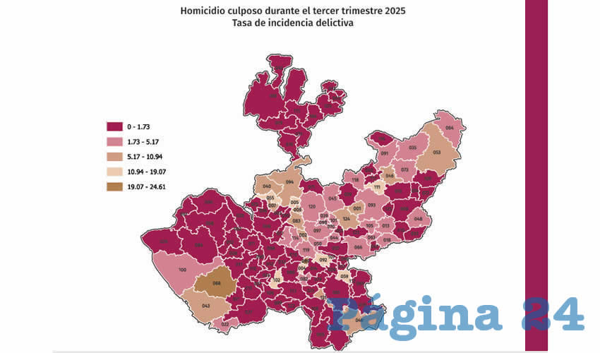 Según el estudio realizado sobre la incidencia delictiva del tercer trimestre del 2025 con respecto al mismo periodo del 2024, el homicidio culposo tuvo una variación de 15.24 por ciento, al pasar de 204 a 237 carpetas de investigación, los municipios en los que sucedieron estos delitos de alto impacto fueron San Pedro Tlaquepaque, Tonalá, Lagos de Moreno y Zapotlanejo.